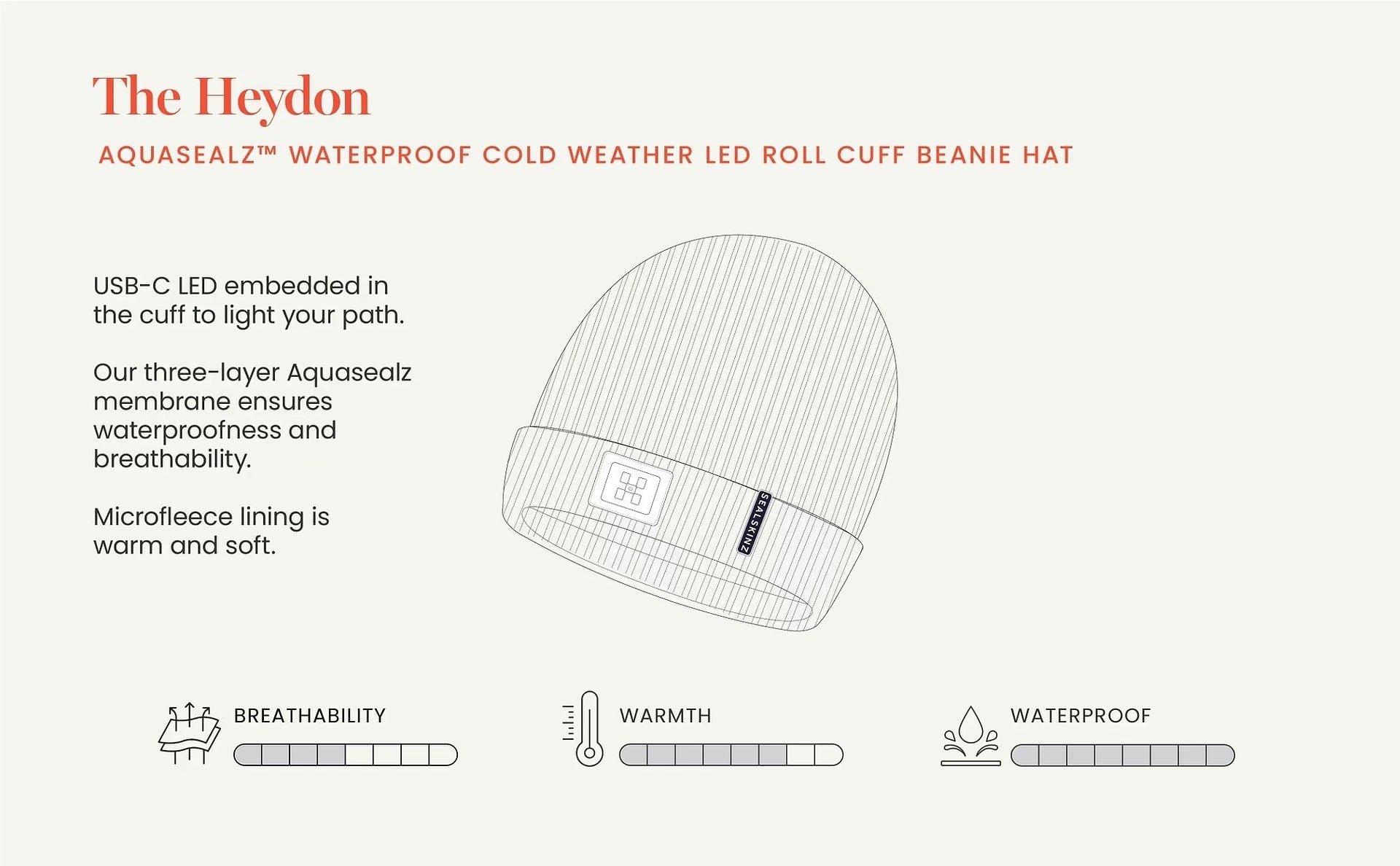 A versatile, waterproof beanie, made for cold winter hikes and mountain treks. Multi-use, the Heydon can be relied upon in a range of colder climates. Acrylic and polyester are made from strong, long-lasting yarns, forming an extra-durable tight knit. A front-facing LED light will light your path on darker trail routes. Also highly effective in warning oncoming traffic of your presence on busy roads.